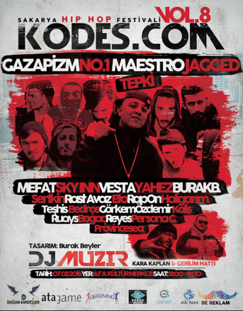 Kodes.com tarafından organize edilen Sakarya Hiphop Fest vol.serinin 8. konseri için geri sayım başladı. Ünlü sanatçıların yanı sıra yerel sanatçıların da katılacağı konserimizin 1 de özel misafiri olacak Hardcore ve horrorcore çalışmaları ile Türkiyede bu müziğin öncüsü olmayı başaran Kodesin yeni albümünü satın alabilirsiniz. konserimizde tam kadro sahne alacak Mc lerin Listesi ise sırası ile Tepki, Gazapizm, No.1, Maestro, Jagged, Kara Kaplan, Gerilim Hattı, Mefat, Skyinn, Vesta, Yahez, Burak Beyler, Sertkin, Rast Avaz, Ruays, Teşhis, Eto, RapOn, Bedros, Görkem Özdemir, Boğaç, Holigan Marmara,Reyes, Kalis, Provincesea, Persona Grata canlı performans sergileyeceklerdir. Şimdiden herkese iyi eğlenceler..