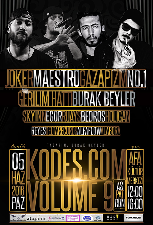 kodes .com tarafından organize edilen Sakarya Hiphop Fest vol. 9 Türkiye nin saygın isimleri yanı sıra yerel sanatçıların katılımı ile gerçekleşecektir.. Sanatçılarımız sırası ile Joker, Gazapizm, No.1, Maestro, Gerilim Hattı, Burak Beyler, Skyinn, Egor, Ruays, Bedros, Holigan, Delta Records, Reyes , Alfa Flow, Alabora olarak kesinleşmiştir. Konserimizde sanatcıların yeni çıkan albümlerini de satın alabilirsiniz.. Albüm ve Posterler hakkında sunucularımız gereken açıklamaları yapacaktır.. Kapıda özelikle şehir dışından gelenler için bilet satışı yapılacaktır..